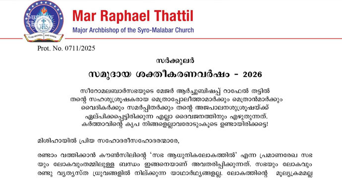 കാക്കനാട്:  സീറോമലബാര്‍ സഭ  2026 സമുദായ ശാക്തീകര ണവര്‍ഷമായി ആചരിക്കുന്നു. ഇത് സംബന്ധിച്ച മേജര്‍ ആര്‍ച്ചുബിഷപ് മാര്‍ റാഫേല്‍ തട്ടിലിന്റെ സര്‍ക്കുലര്‍  ഇന്നലെ (ഒക്ടോബര്‍ 12 ഞായര്‍) സീറോമലബാര്‍സഭയിലെ എല്ലാ ദേവാലയങ്ങളിലും വിശുദ്ധ  കുര്‍ബാനമധ്യേ വായിച്ചു. അഞ്ചാമത് മേജര്‍ ആര്‍ക്കിഎപ്പിസ്‌കോപ്പല്‍ അസംബ്ലിയില്‍ നടന്ന ചര്‍ച്ചകളുടെയും കഴിഞ്ഞ ഏതാനും വര്‍ഷങ്ങളായി നടന്നുവന്ന പഠനങ്ങളുടെയും വെളിച്ചത്തിലാണ് വര്‍ഷാചരണം പ്രഖ്യാപിച്ചത്.