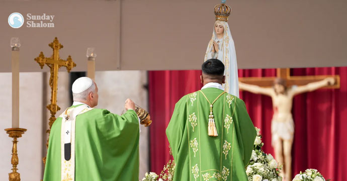 ദൈവമാതാവിനോടുള്ള ഭക്തി ഭൂമിയുടെ മുഖം തന്നെ എന്നന്നേക്കുമായി മാറ്റിമറിച്ചെന്ന് പാപ്പ തുടര്ന്നു. നമുക്ക് മരിയന് ഭക്തി നവീകരണത്തിനും പരിവര്ത്തനത്തിനും ഒരു പ്രേരകശക്തിയായി ഉപയോഗിക്കാം. മറിയത്തില്, എളിമയും ആര്ദ്രതയും ദൗര്ബല്യത്തിന്റെ അടയാളങ്ങളല്ല, മറിച്ച് ശക്തരുടെ ഗുണങ്ങളാണെന്ന് നാം കാണുന്നു. നീതിക്കുവേണ്ടിയുള്ള നമ്മുടെ പോരാട്ടങ്ങള്ക്ക് മറിയത്തിന്റെ സാന്നിധ്യം ഗാര്ഹിക ഊഷ്മളത നല്കുന്നതായും പാപ്പ പറഞ്ഞു. പ്രസംഗത്തിന് ശേഷം, പോര്ച്ചുഗലില് നിന്ന് കൊണ്ടുവന്ന ഫാത്തിമ മാതാവിന്റെ യഥാര്ത്ഥ തിരുസ്വരൂപത്തിന് മുന്നില് സഭയെയയും ലോകത്തെയും പരിശുദ്ധ കന്യകാമറിയത്തിന് പാപ്പ സമര്പ്പിച്ചു. യുദ്ധത്തിന്റെ ബാധയാല് പീഡിപ്പിക്കപ്പെട്ടവര്ക്കായി പാപ്പ പത്യേകം പ്രാര്ത്ഥിച്ചു.