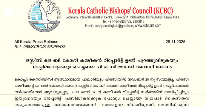 2023 മെയ് 17 ന് കമ്മീഷന് റിപ്പോര്ട്ട് സര്ക്കാരിന് സമര്പ്പിച്ചിട്ടും ഇതുവരെയും റിപ്പോര്ട്ട് പ്രസിദ്ധീകരിക്കുക പോലും ചെയ്യാത്ത നിലപാട് ക്രൈസ്തവ സമൂഹത്തോടുള്ള അവഗണനയാണെന്ന് പാലാരിവട്ടം പിഒസിയില് നടന്ന സമ്മേളനം വിലയിരുത്തി. വരാനിരിക്കുന്ന തിരഞ്ഞെടുപ്പുകളില് സമ്മതിദാനാവകാശം വിവേകപൂര്വ്വം വിനിയോഗിക്കണമെന്ന് സമ്മേളനം ആഹ്വാനം ചെയ്തു.