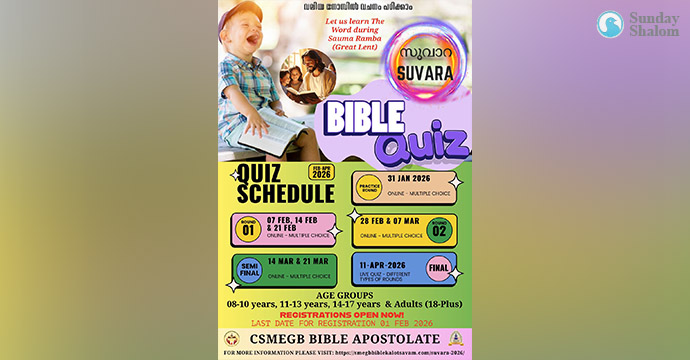 കുട്ടികള്ക്കും മുതിര്ന്നവര്ക്കുമായി നടത്തുന്ന സുവാറ ബൈബിള് ക്വിസ് മത്സരങ്ങളുടെ രജിസ്ട്രേഷന് ആരംഭിച്ചു. മത്സരത്തില് പങ്കെടുക്കുന്നതിനായി പേരുകള് നല്കുന്ന തിനുള്ള അവസാന തീയതി ഫെബ്രുവരി ഒന്നാണ്.